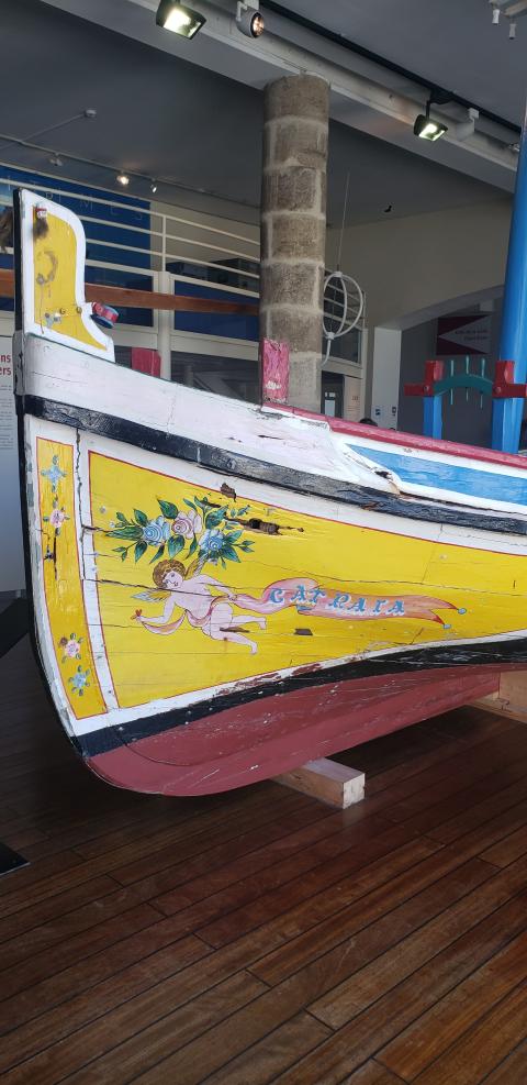 Catraia ist ein Fischer- und Frachtboot des Tage-Flusses in Portugal – aus der Zeit um 1940. Mit seiner großen Lagerkapazität ist es für den Warentransport bestimmt – aber das hindert nicht daran, reich verziert zu sein! Seine naiven Ornamente sind typisch für die Tageregion („Bote do Tejo“). Einer seiner Besitzer änderte die traditionelle Dekoration. Er malte einen Engel über den Platz, der früher von einem Toreador eingenommen wurde! Das Ornament an der Trennwand der hinteren Kammer ist eine schlichte Landschaft.