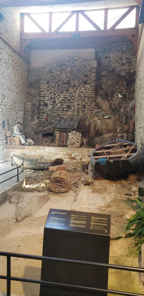 Here we have reconstructed a ‘shelter harbour’, typical for the Cap Sizun in the 1920s. A natural shelter, often found in the depths of ill-protected crevices, is equipped with jetties or steeply sloping slipways. When this protection becomes insufficient, the boats are put out of the reach of the sea: The fisherman on the right pushes his canoe onto the inclined slipway. He is helped by a man who operates the winch handle. Operated by a crank, it allows the canoe to be hoisted using a chain wound around a drum. Fishing for shellfish was fruitful in these rocky areas.