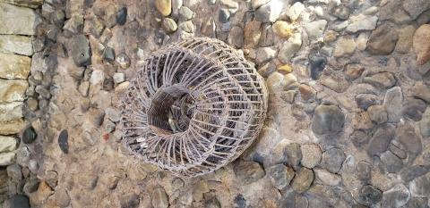 The semi-circular lobster pots are made in a mould using pieces of wicker. The base opposite the opening is weighted down with pebbles. These are mainly used for catching lobsters.