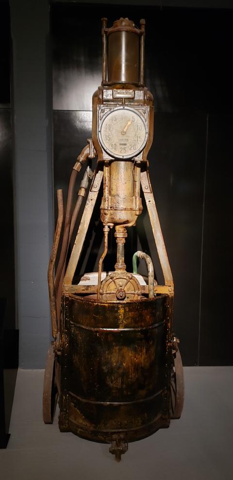 This petrol pump was installed at Rosmeur harbour, here in Douarnenez, at the beginning of the 20th century. It was made by the company Joseph Raphalen. It could be easily displaced to reach the corners of the quays and moles where the boats very anchored. It was mounted on two wheels. The counter recorded all flow rates from 5 to 5 litres with a dial and a bell.